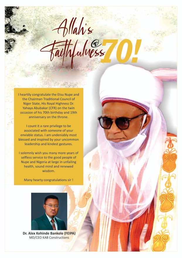 Heartily congratulate the Etsu Nupe and the Chairman Traditional Council of Niger State, His Royal Highness Dr. Yahaya Abubakar (CFR) on the twin occasion of his 70th birthday and 19th anniversary on the throne.