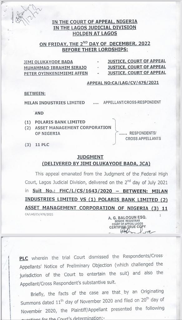 According to the Certified True Copy of the judgment signed and released on Wednesday by the Senior Registrar of the court, A. G. Balogun, the appellate court held that the two issues Milan Industries as Appellant/Cross Respondent was contesting were resolved in its favour. According to the lead judgment by Justice Jimi Bada, “With the resolution of Issues No. 1 and 2 in favour of the Cross Respondent and against the Cross Appellants (Polaris Bank, AMCON and 11 PLC), it is my view that this cross appeal lacks merit and it is hereby dismissed.”