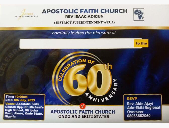The Apostolic Faith Church, Ondo State District will celebrate her 60 years of existence on July 8