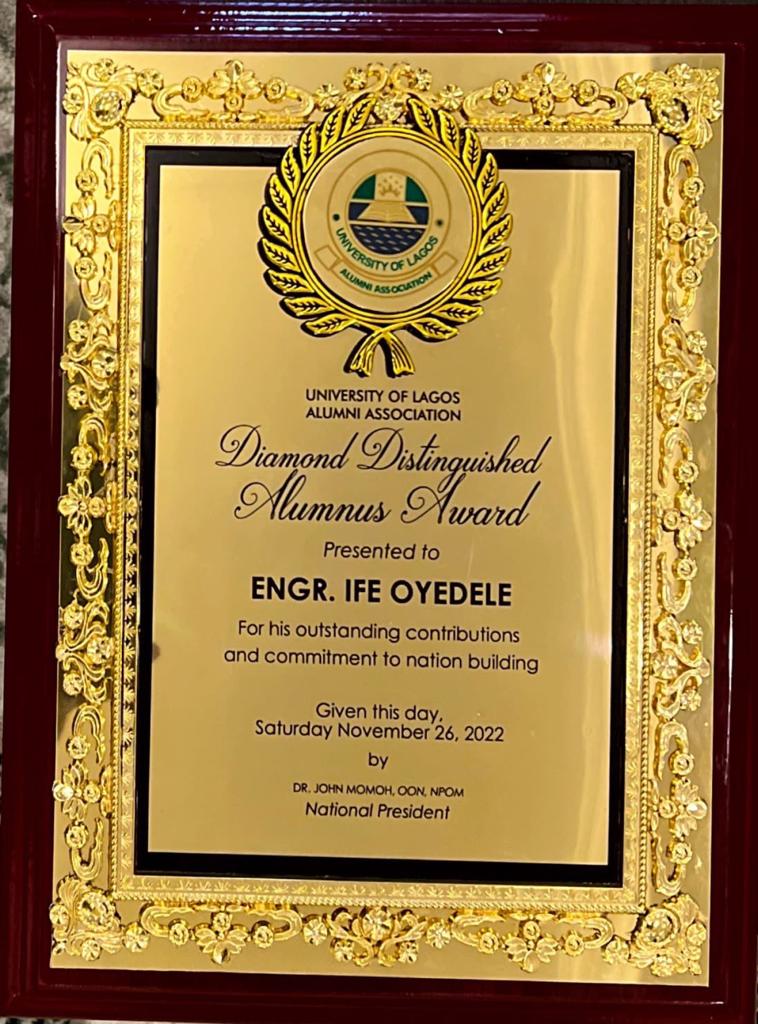 The Executive Director, Niger Delta Power Holding, Engr. Ife Oyedele, has been honored by the organizing committee of the Diamond Jubilee of the University of Lagos Alumni Association.