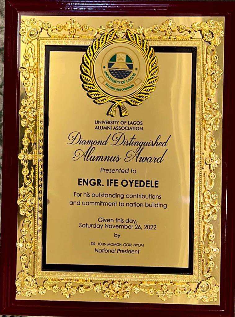 The Executive Director, Niger Delta Power Holding, Engr. Ife Oyedele, has been honored by the organizing committee of the Diamond Jubilee of the University of Lagos Alumni Association.