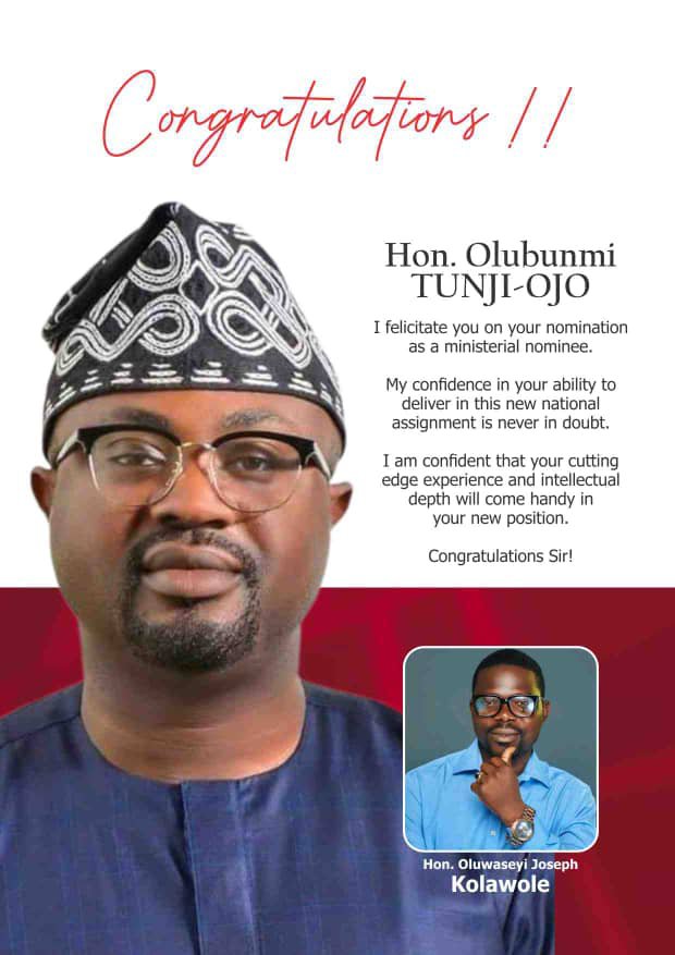 Hon. Kolawole Oluwaseyi has congratulated Hon. Olubunmi Tunji-Ojo, representing Akoko North East/ North West Federal Constituency, Ondo State on his ministerial nomination.
