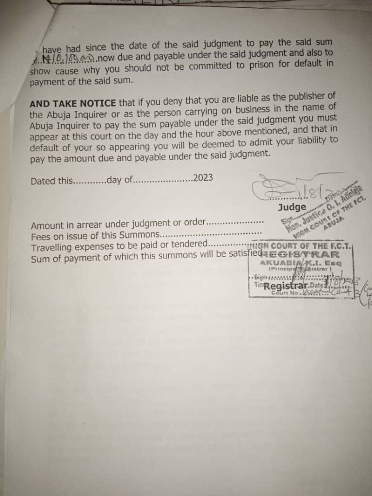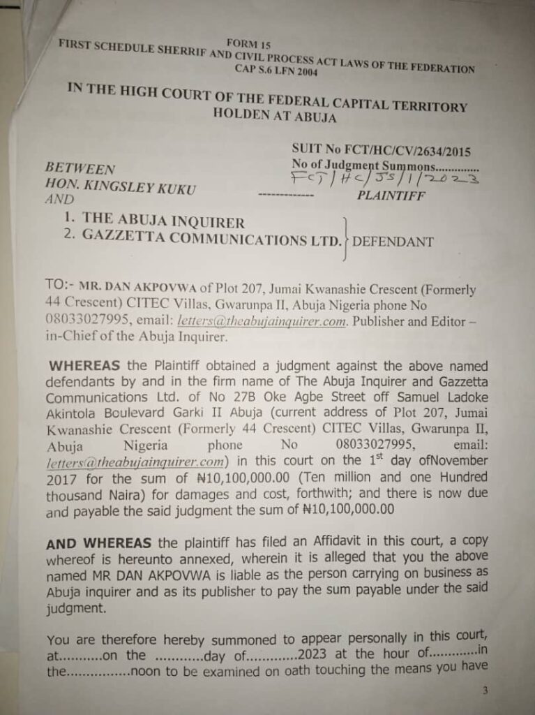 An Abuja High Court on Tuesday, 1st August, 2023 issued a court summons on the Publisher and Editor-in-Chief of The Abuja Inquirer an Abuja based newspaper Mr Dan Akpovwa to appear before it to show cause why he should not be committed to prison for the default in the payment of a N10 MILLION naira judgment debt awarded against the newspaper in 2017 for a libelous publication carried in the newspaper in 2015 and published against former Special Adviser to former President Goodluck Jonathan and Chairman Presidential Amnesty Program Hon Kingsley Kuku.