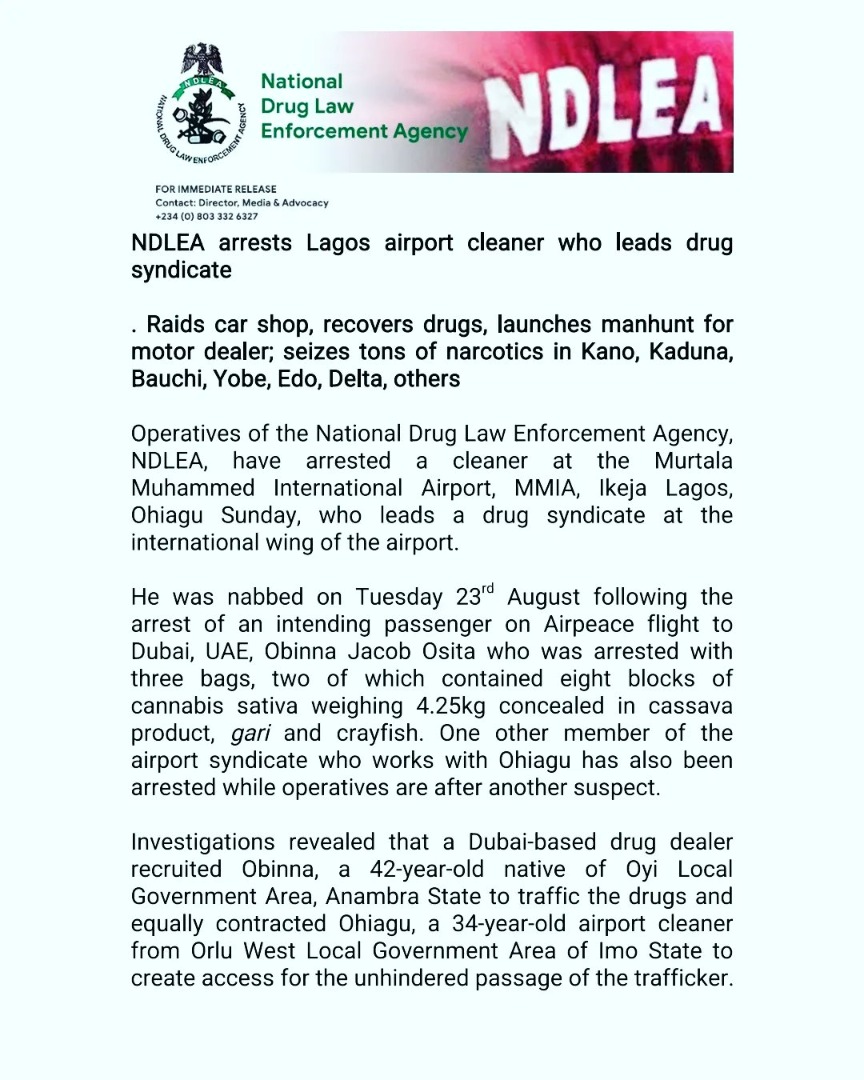 Ohiagu Sunday, a cleaner at Murtala Muhammed International Airport, Ikeja, Lagos who leads a drug syndicate at the airport international wing has been nabbed by the National Drug Law Enforcement Agency.