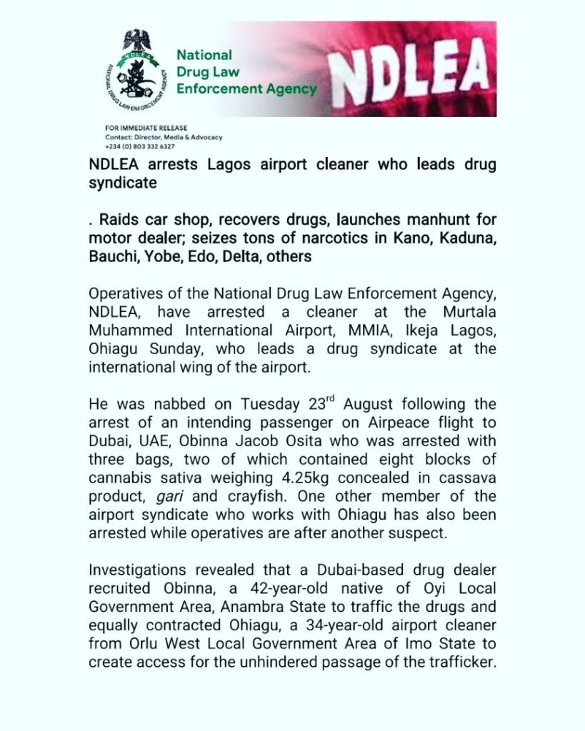“Operatives of the National Drug Law Enforcement Agency, NDLEA, have arrested a cleaner at the Murtala Muhammed International Airport, MMIA, Ikeja Lagos, Ohiahu Sunday, who leads a drug syndicate at the international wing of the airport.