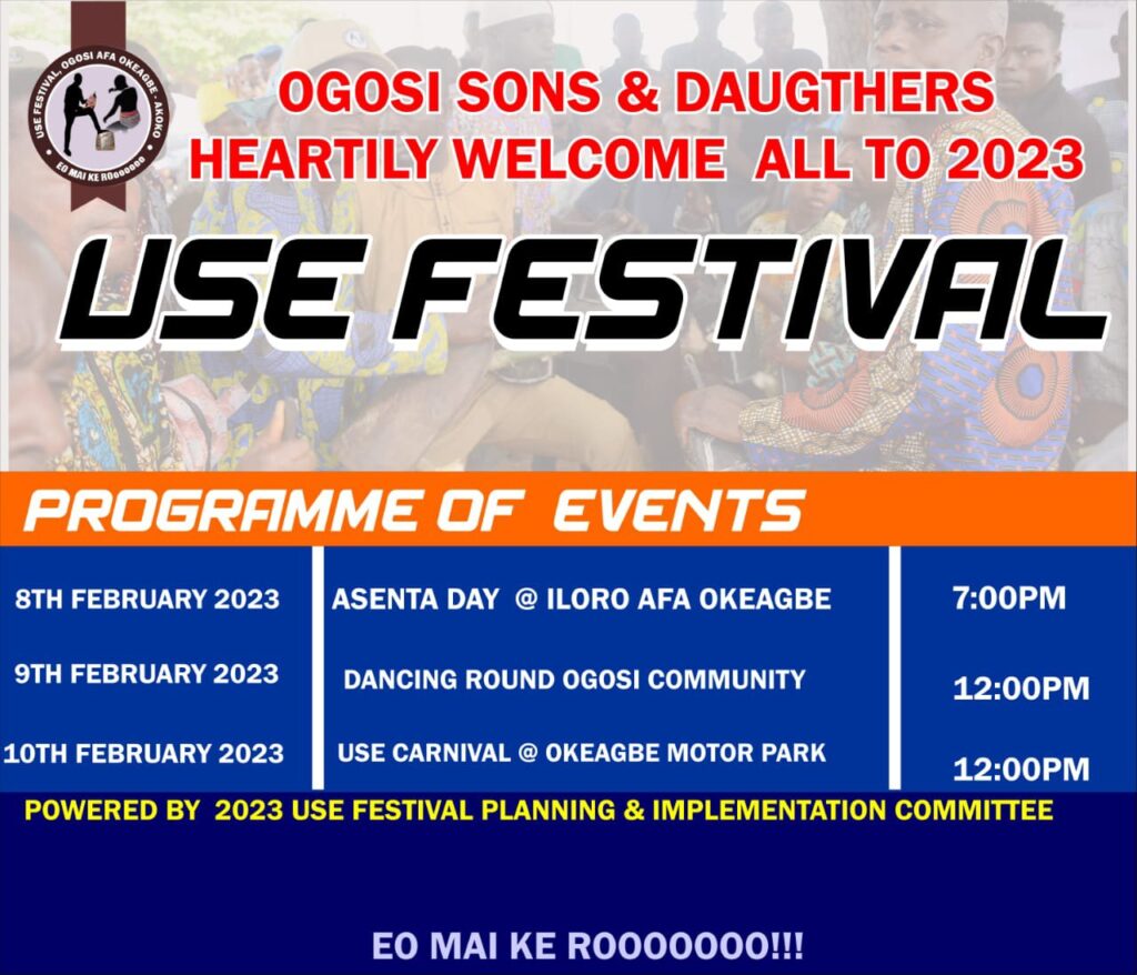 According to the findings, USE festival is the festival that open all other annual festivals in Afa Okeagbe, it shows how giant and brave Ogosi forefathers used to be in the olden days. It is strongly agreed that cultural heritage or historical sites are very significant for a community as Cultural Heritage and Historical sites always attract tourists. USE festival is usually celebrated early February every year for a period of nine days. The 2023 edition of USE festival would be an exceptional one with more active involvement of the sons and daughters of Ogosi Afa, Okeagbe both within the country and the diaspora.