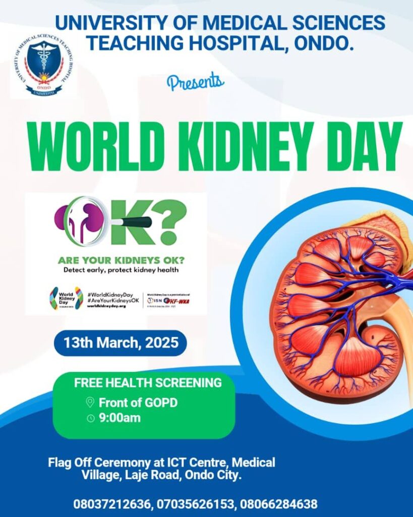 The University of Medical Sciences Teaching Hospital (UNIMEDTH) recently celebrated World Kidney Day by offering free medical checkups to the public. This year’s theme, “Are Your Kidneys OK? Detect Early, Protect Kidney Health,” aimed to raise awareness about kidney health, early detection, and preventive care.